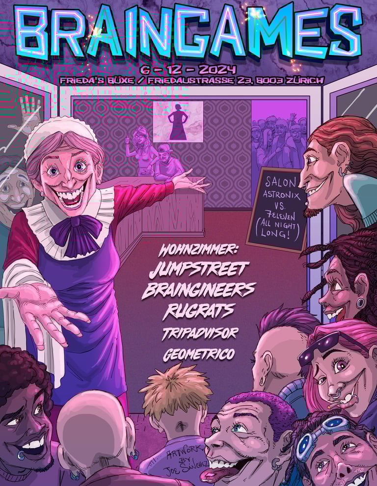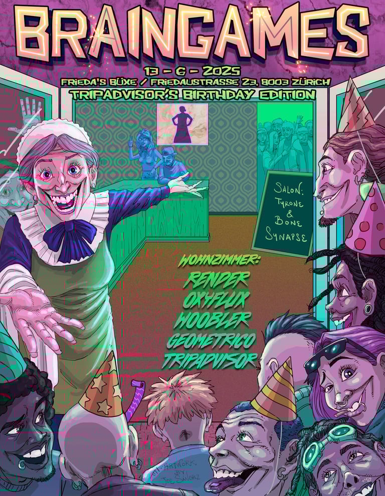 Braingames Records hosts its own party series at Friedas Büxe in Zurich, curates the second floor at Burning Mountain festival in Zernez and hosting the second floor at raumklang events. Our events are driven by a powerful yet intimate atmosphere, where music, connection, and shared moments come together. It is especially important to us that everyone feels welcome, safe, and comfortable on our dancefloors. Braingames events are built on respect, openness, and a strong sense of community, creating a familiar vibe where lasting memories and friendships are formed.